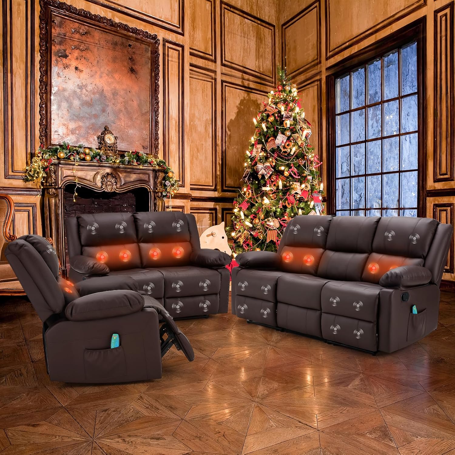 · In StockYODOLLA 3 PCS Recliner Sofa Set Overstuffed Leather Reclining Sofa, Brown