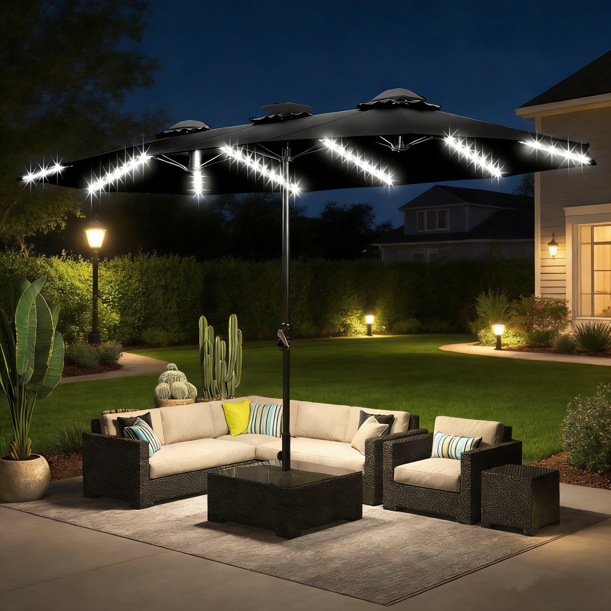 15 x 9 FT Double-Sided Black Patio Umbrella – Large, Durable & Solar-Powered Upgrade your outdoor space with this 15...