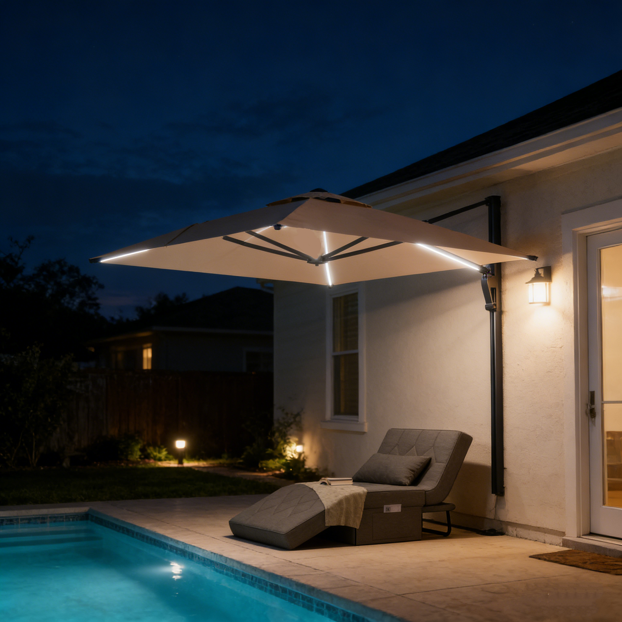 A patio umbrella with lights, especially solar-powered models, is perfect for evening use. They collect sunlight by day and provide gentle illumination after dark without wires.