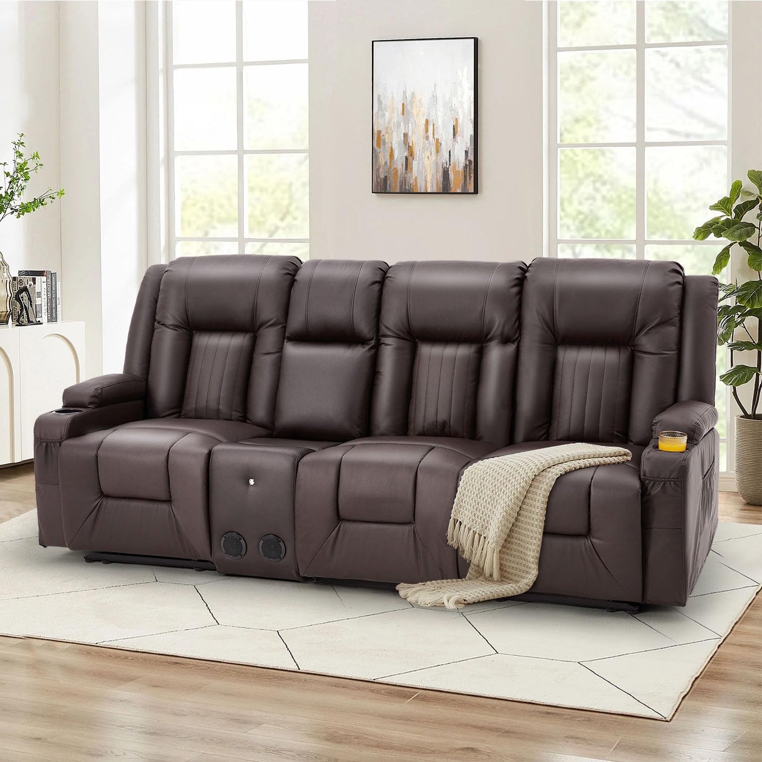 Designed with 2 cup holders and side pockets to keep drinks, remotes, and essentials within reach.