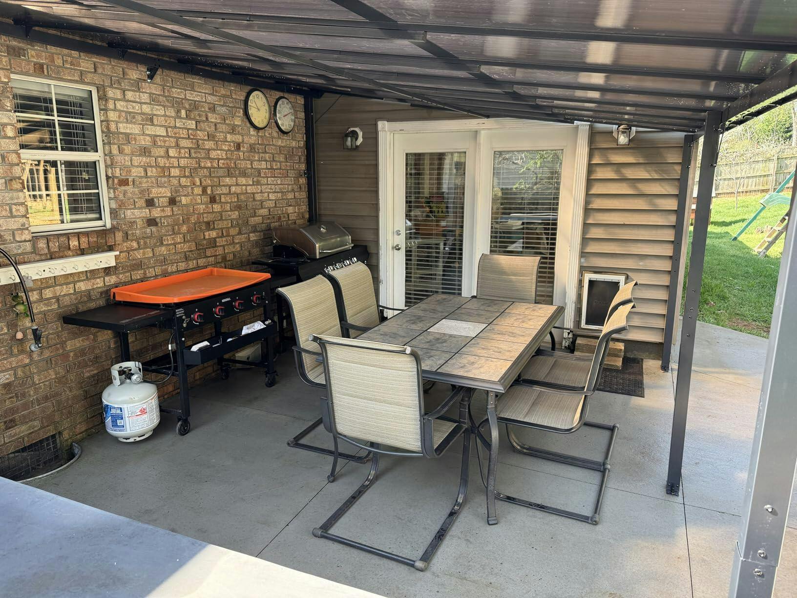 It fits a full outdoor dining set and some potted plants, and the black color hides dust way better than light colored options.