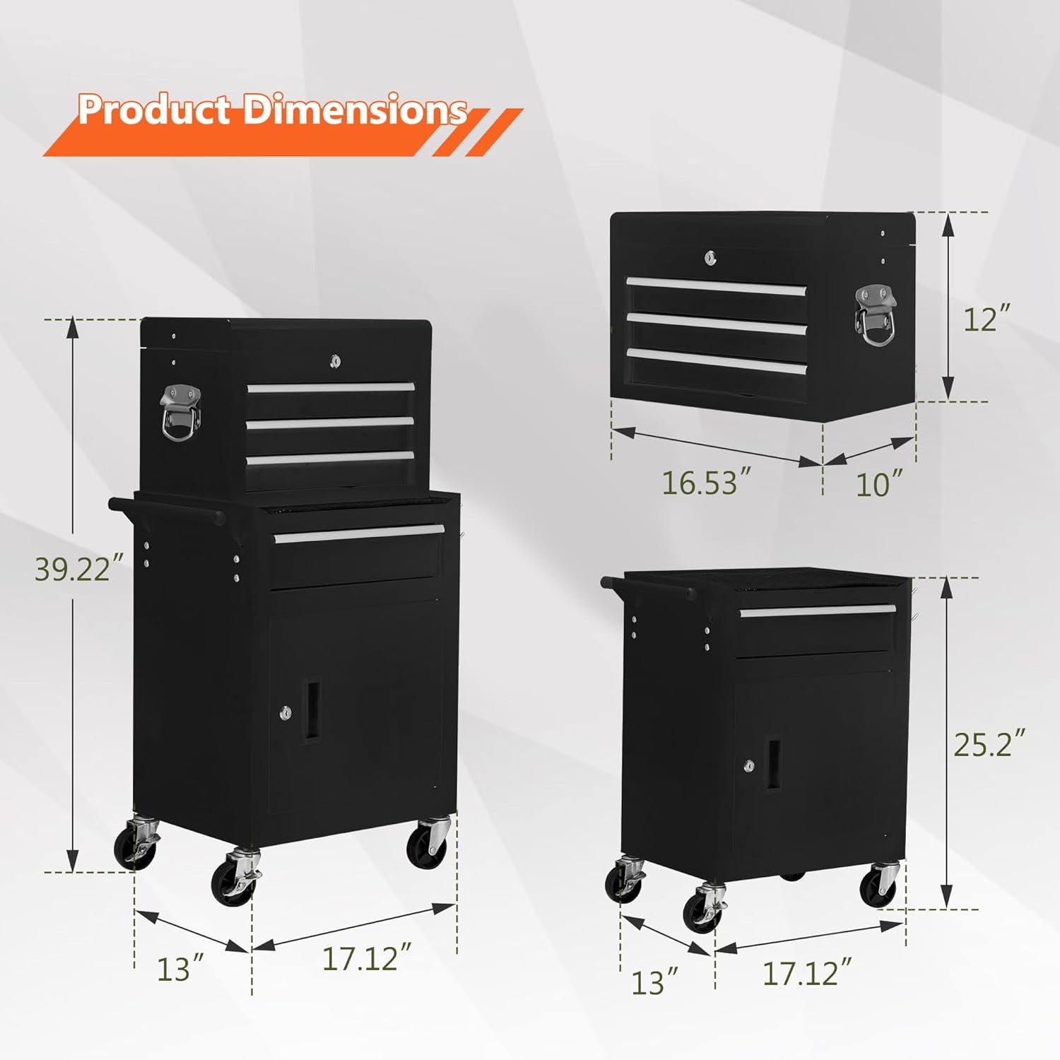 • Ample Storage Space: Featuring a spacious main cabinet (39" H x 17" W x 13" D) and a versatile drawer section, this rolling tool box offers ample room to organize and store a wide range of tools and accessories. The deep drawers and large cabinet space make it easy to keep everything from small hand tools to bulky power tools in one secure location