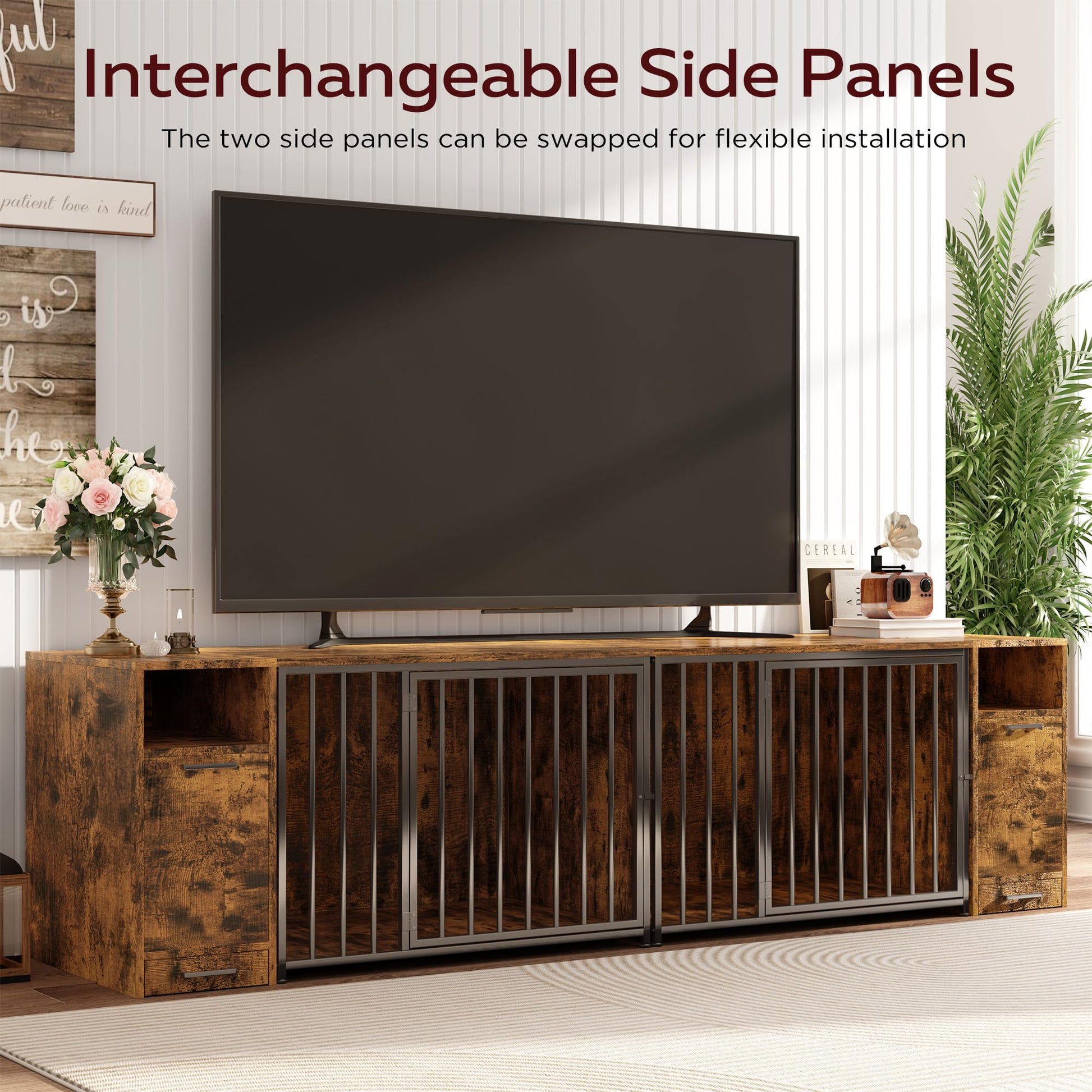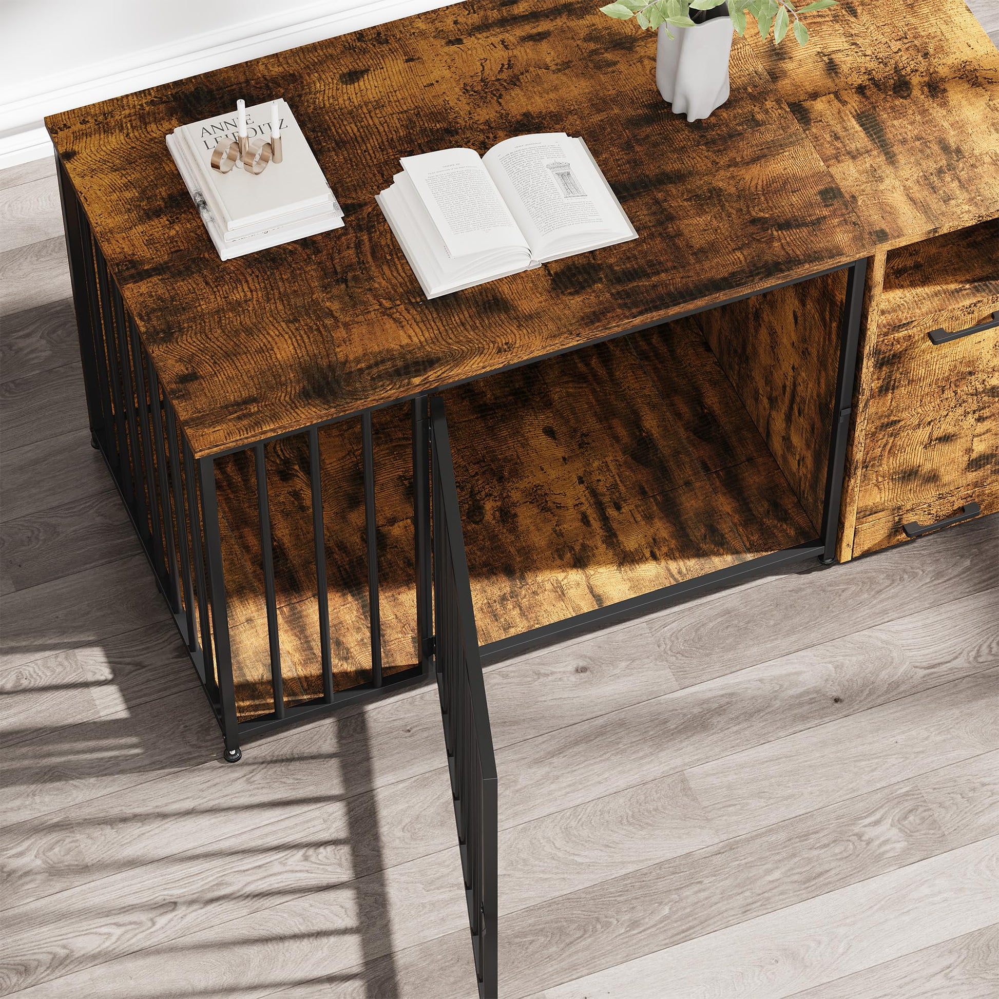 The YODOLLA Dog Crate Furniture offers a perfect blend of comfort, security, and style for your pet and home. Crafted from solid wood and reinforced steel, this 42-inch indoor kennel provides a chew-proof and escape-proof environment for medium to large dogs. The top storage cabinet allows you to neatly organize pet supplies, while the rustic brown finish complements any interior décor. Designed to double as a stylish end table, this multifunctional dog crate saves space and enhances your living area, giving your pet a cozy, private spot that fits beautifully into your home.