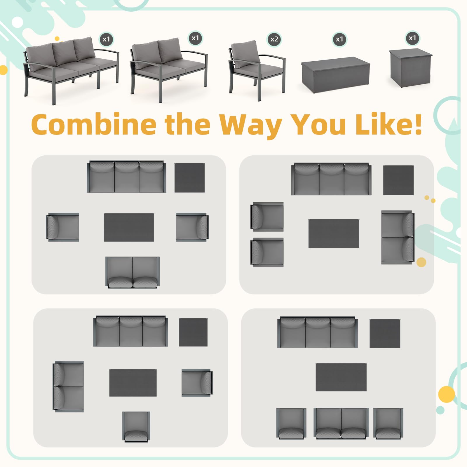 This 6 piece patio set features a soft yet durable 80% cotton and 20% polyester fabric blend for lasting comfort. The spacious coffee and side tables offer large storage compartments with moisture-proof PVC bottoms, adding practical convenience to this all weather patio set. Crafted with a rust-resistant iron frame and powder coating, this metal patio conversation set is built to withstand outdoor conditions. The flexible sectional includes two single chairs, a loveseat, sofa, coffee table, and side table—perfect for patios, gardens, or balconies. Backed by lifetime support, this large patio set is designed for comfort and durability.
