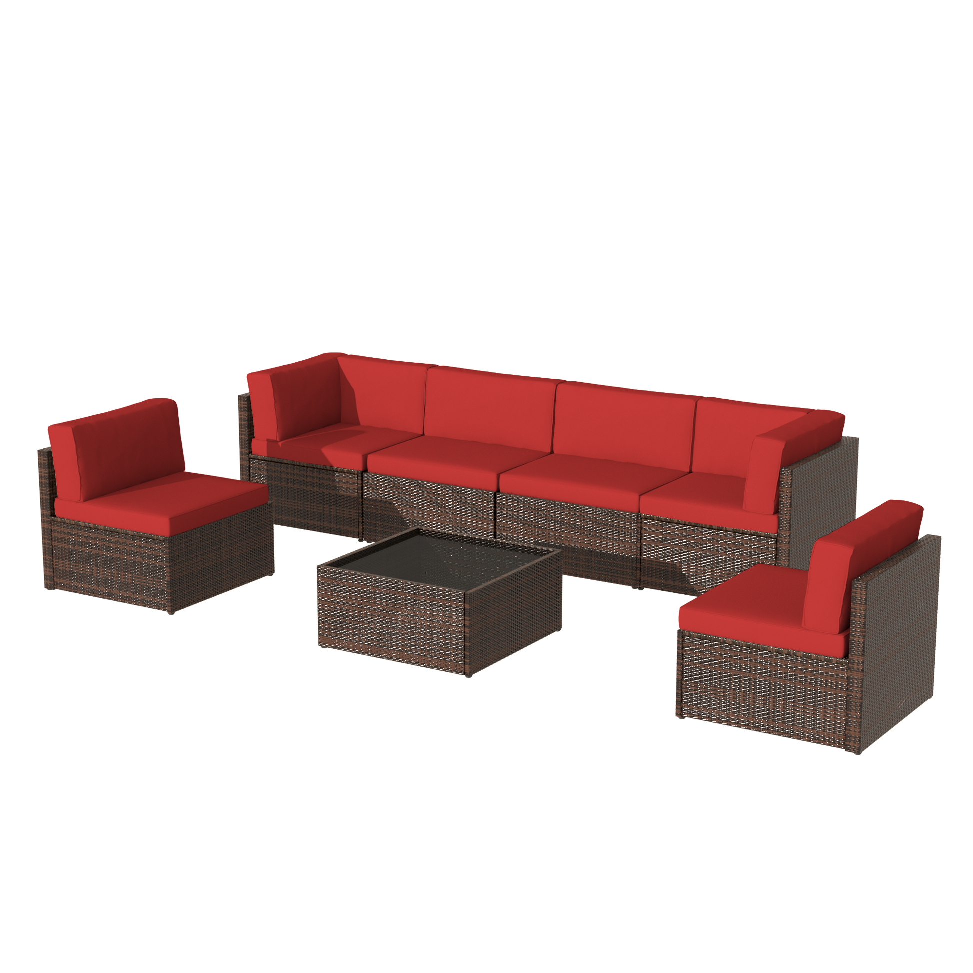 This 7 piece patio furniture set includes 4 armless chairs, 2 corner chairs, and a tempered glass coffee table—perfect for creating a flexible conversation set patio furniture layout. Built with a sturdy steel frame and wrapped in durable PE wicker, this wicker outdoor furniture set offers long-lasting use for any outdoor space.