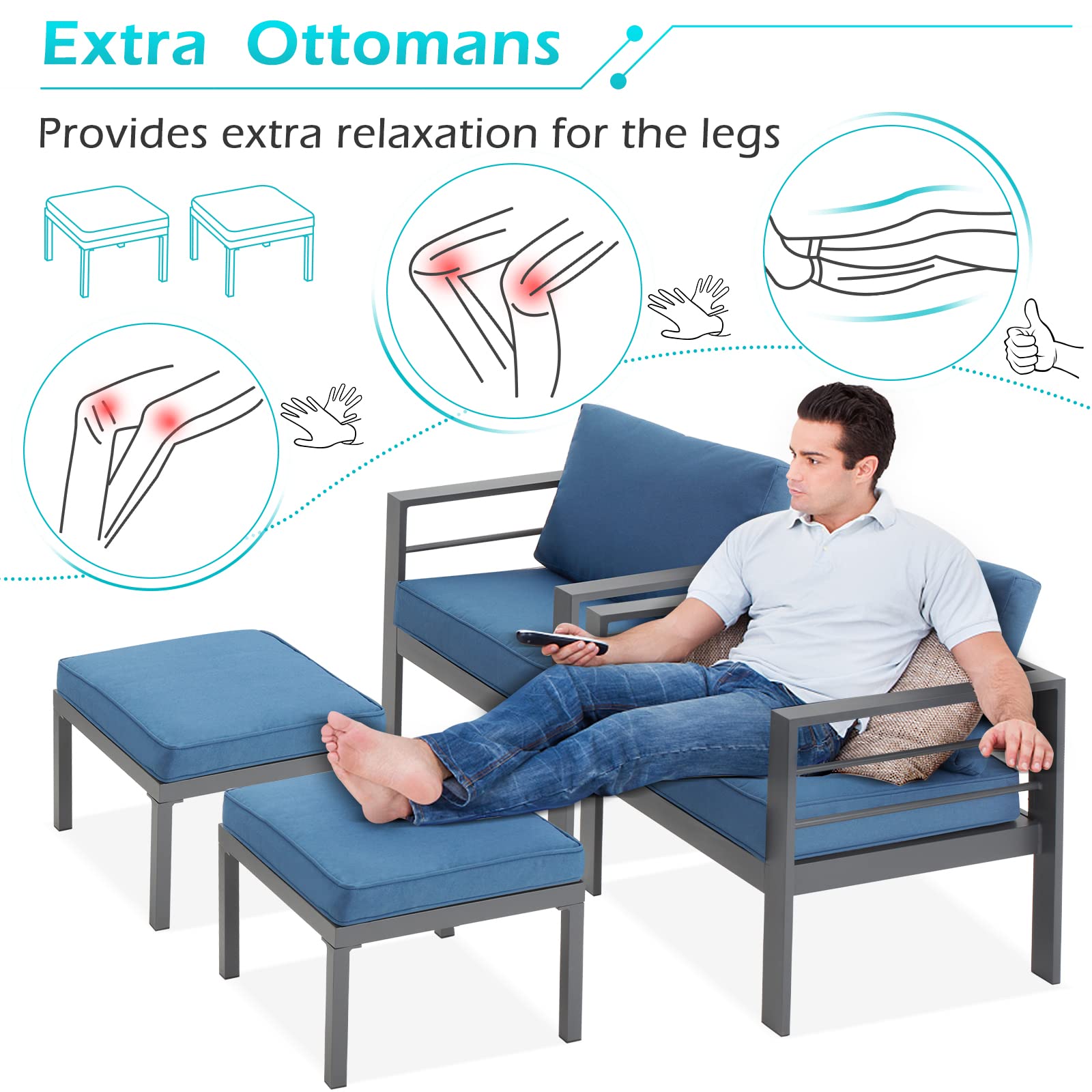 This 7 piece patio furniture set features a rustproof aluminum frame and weather-resistant cushions, combining durability with clean modern style. Designed for comfort, the deep seats and thick foam cushions offer excellent support—ideal for tall users and long lounging sessions.