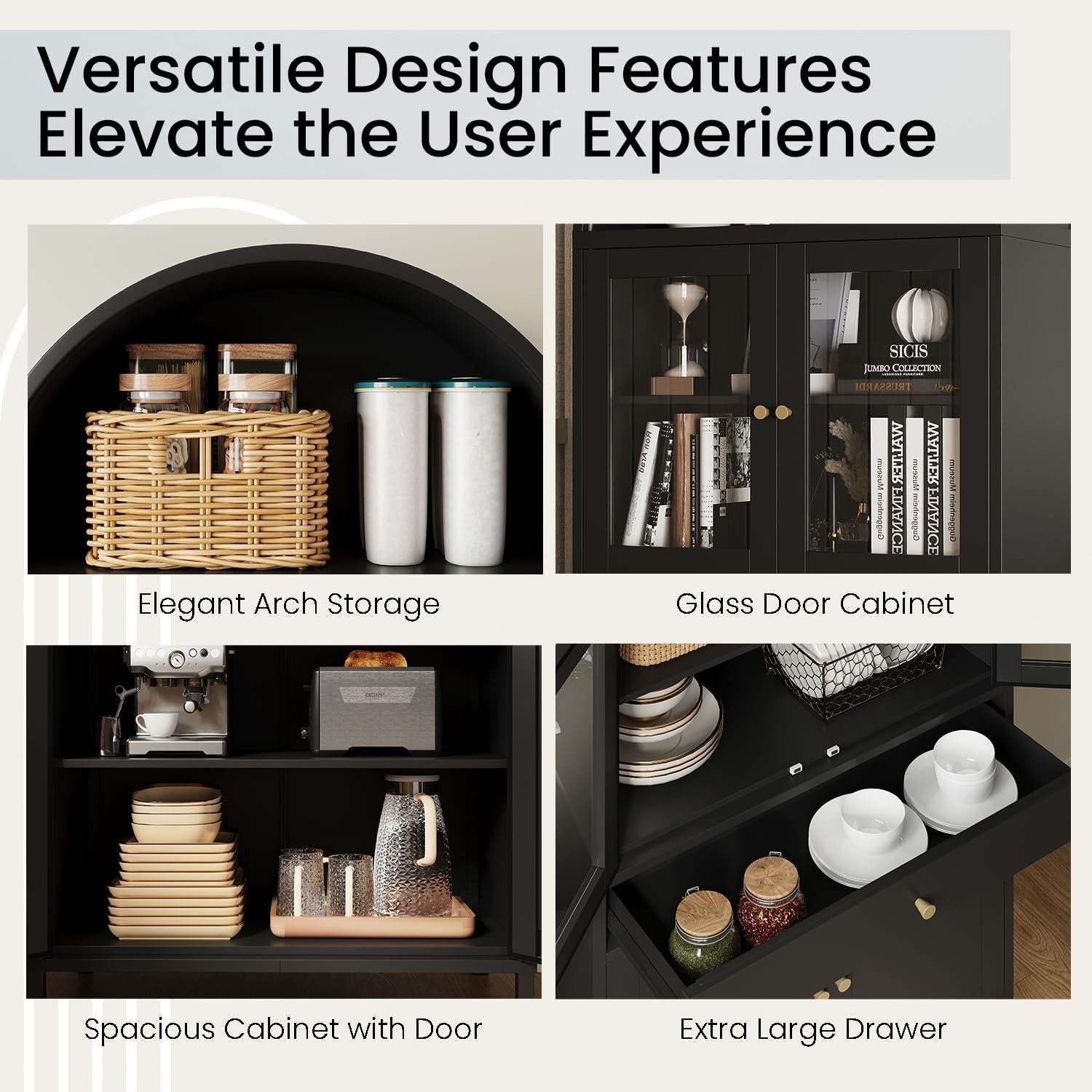 This cabinet is a game-changer for my home. The arched design and glass doors add a touch of elegance, making it a standout piece in my kitchen. The adjustable shelves and spacious drawer provide ample storage, keeping everything organized and within reach. It's not just functional—it's a statement piece that has transformed my space