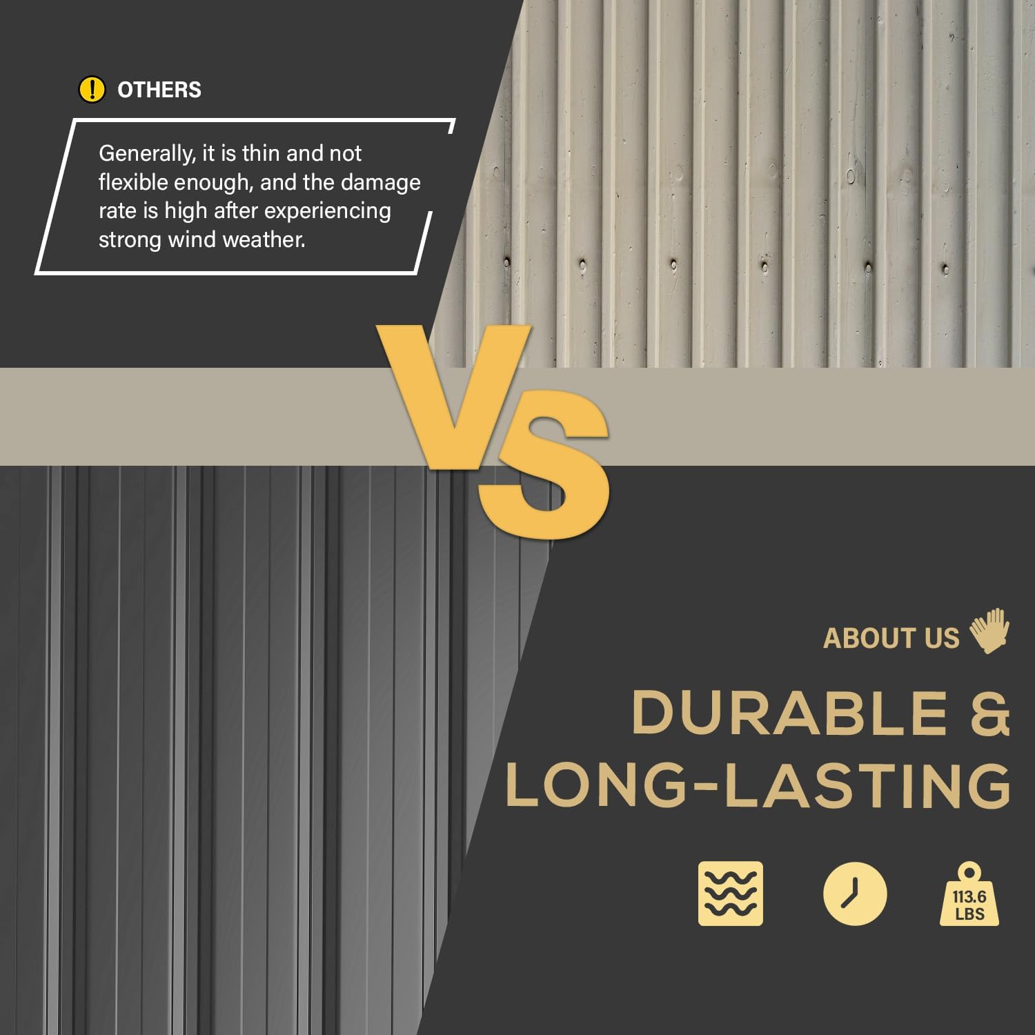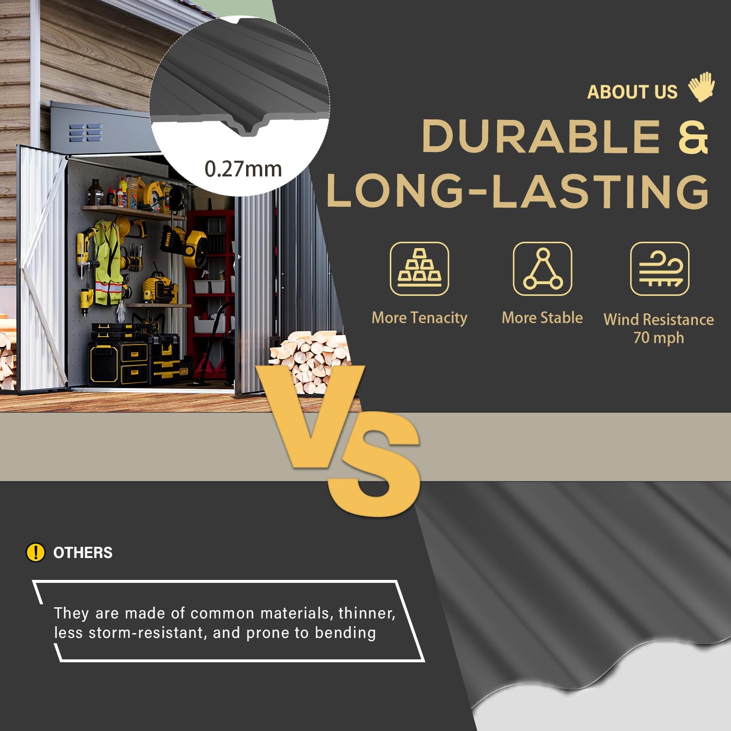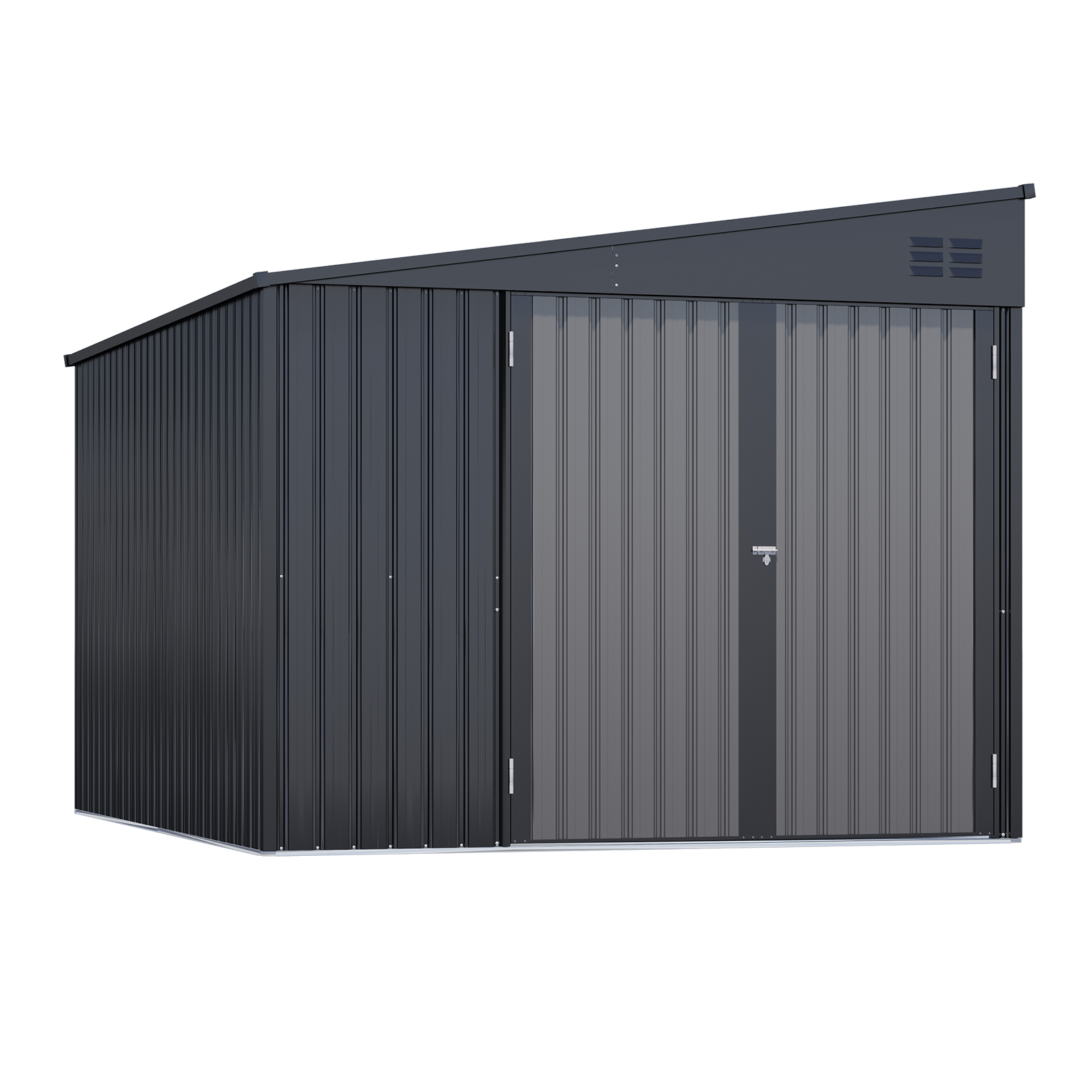 The YODOLLA 8x10 Lean-to Shed in dark gray is a top choice for your backyard storage sheds. With a generous 80-square-foot footprint and a 2.3-foot door, this 8x10 shed offers ample space to store 10 lawnmowers, 20 bicycles, 8 snowmobiles, or 3 Vespa scooters. Perfect as a tool storage shed, it provides reliable space for all your outdoor equipment. Constructed with galvanized metal, it resists rust, oxidation, and moisture, while the sloped roof prevents water accumulation, making it a durable and weather-resistant option. The built-in shed ventilation ensures proper airflow, keeping your items dry and well-protected. With enhanced metal plates, this 8x10 metal shed weighs 180 pounds, providing superior stability and wind resistance of up to 70 mph. Offering easy installation, a 60-day warranty, and 24/7 customer support, this metal storage shed is the perfect solution for your outdoor storage needs.