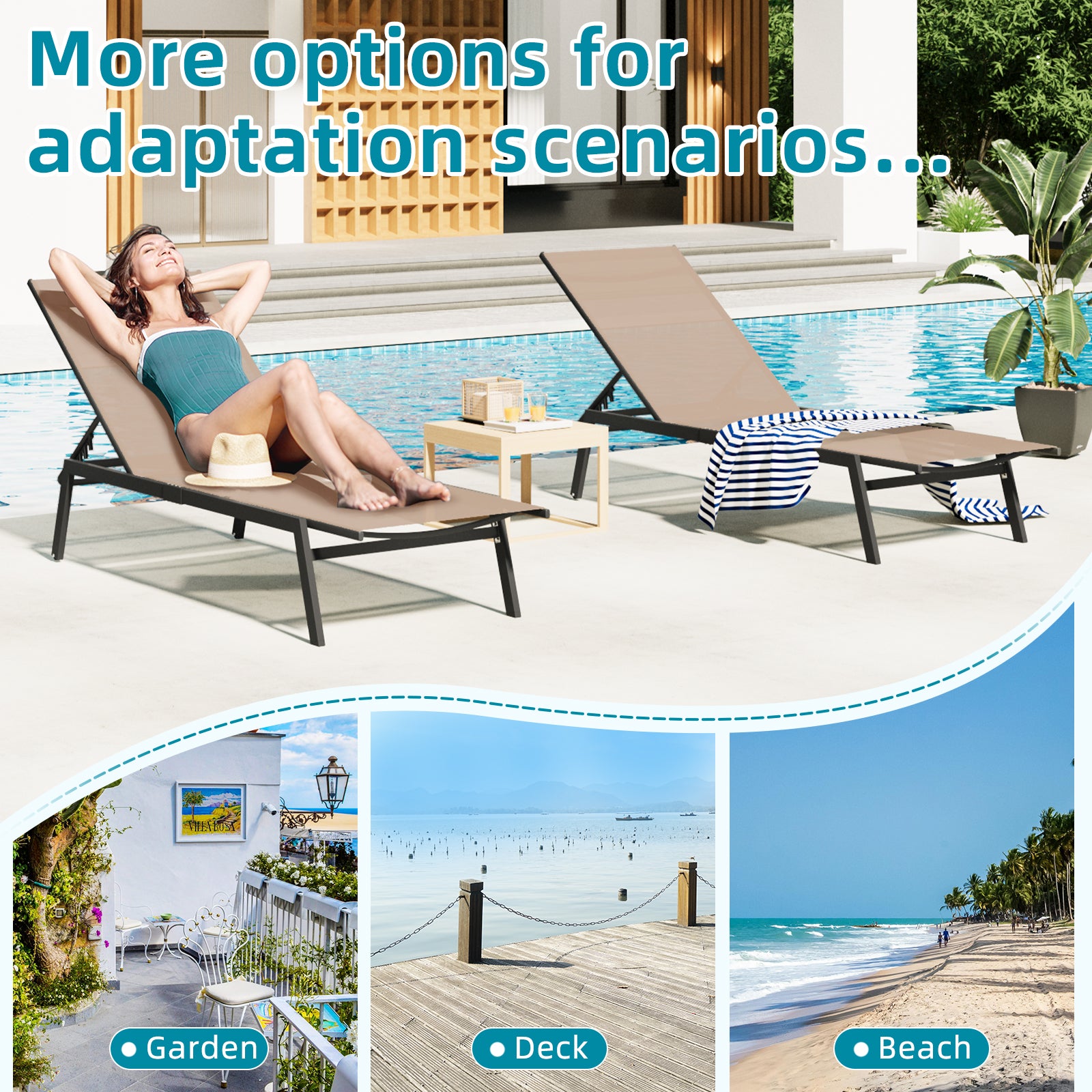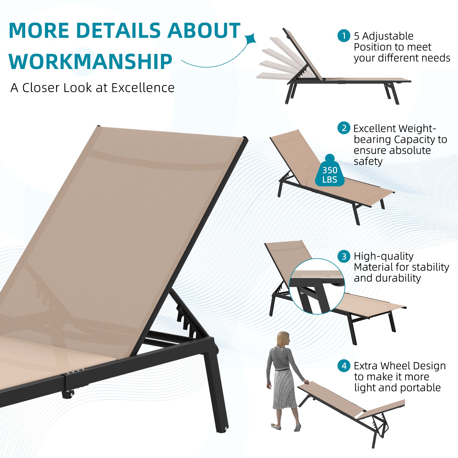 Relax in comfort with the YODOLLA beige chaise lounge, featuring a sleek curved chaise lounge design. Built with a sturdy, powder-coated aluminum chaise lounge frame, it supports up to 330 lbs, ensuring durability for long-term outdoor use. This pool lounge chair is designed with convenience in mind, featuring two wheels for easy movement, allowing you to position it effortlessly wherever you need. Whether you're by the pool or in your garden, this convertible chaise lounge offers both style and portability. Made with UV-resistant, breathable Textilene fabric, it’s one of the best outdoor chaise lounges, offering comfort and durability without the need for additional cushions. Easy to assemble and disassemble, this lounge chair is perfect for compact storage during the off-season.