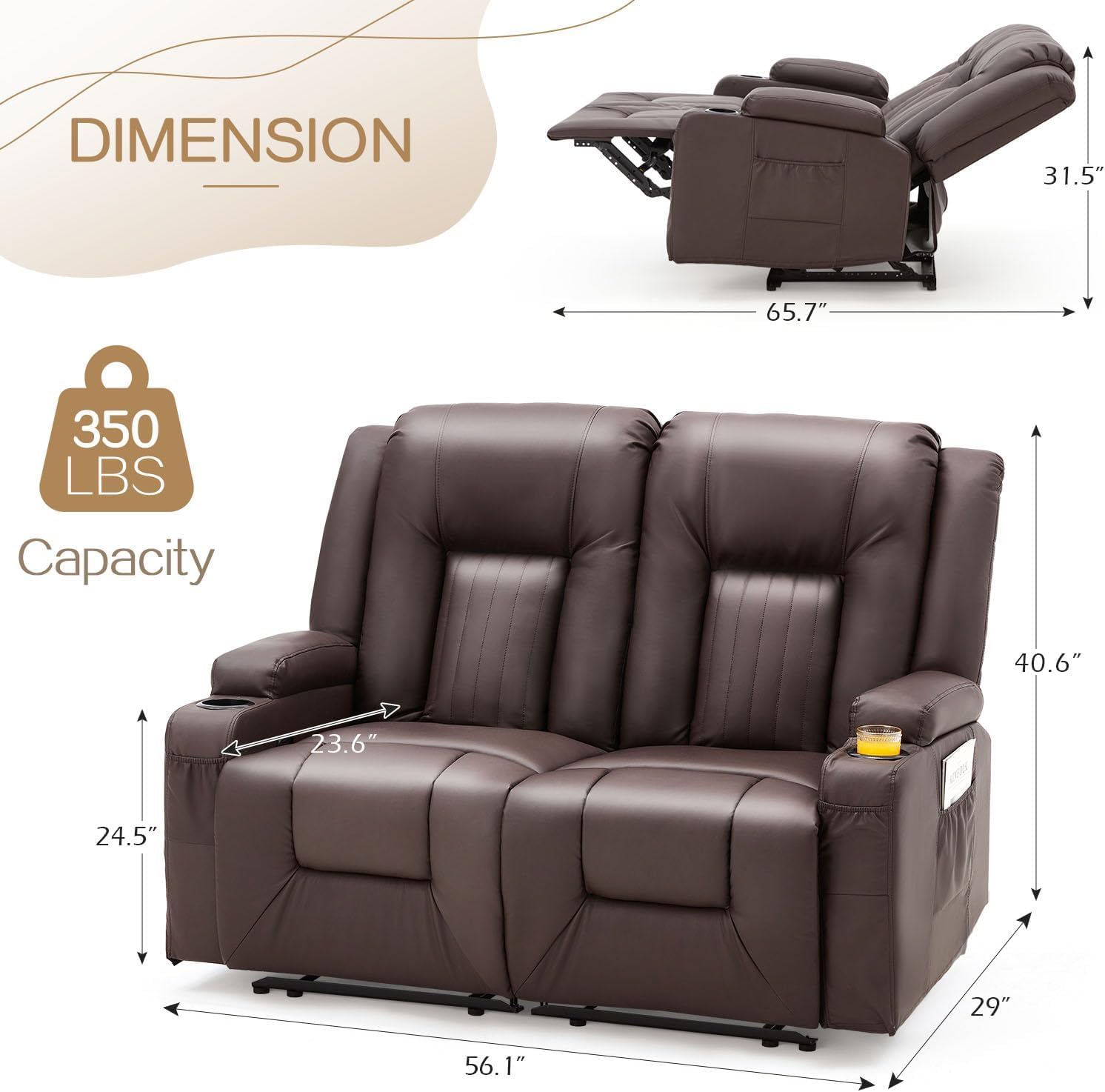 • 【Multiple Scenarios & Dimension】: You can place the loveseat recliner sofa in the RV, theather, office, study room, office, etc. OVERALL DIMENSION: 56.1"( W)*29"(D)*40.6"(H). RECLINING DIMENSION: 56.1"(W) x 65.7"(D) x 31.5"(H).