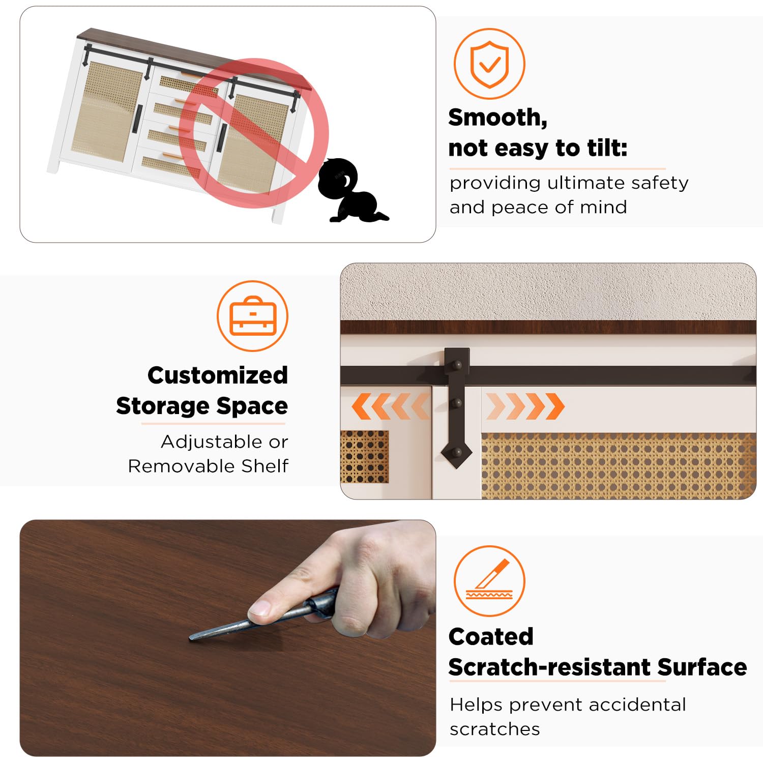 • 【Spacious Storage Solution】With its 55"x16"x31" dimensions, this multifunctional sideboard cabinet with drawers offers generous storage through 2 smooth-gliding rattan doors and 4 deep drawers. Easily organize tableware, pillow, media equipment or kitchen essentials while maintaining a clutter-free environment.