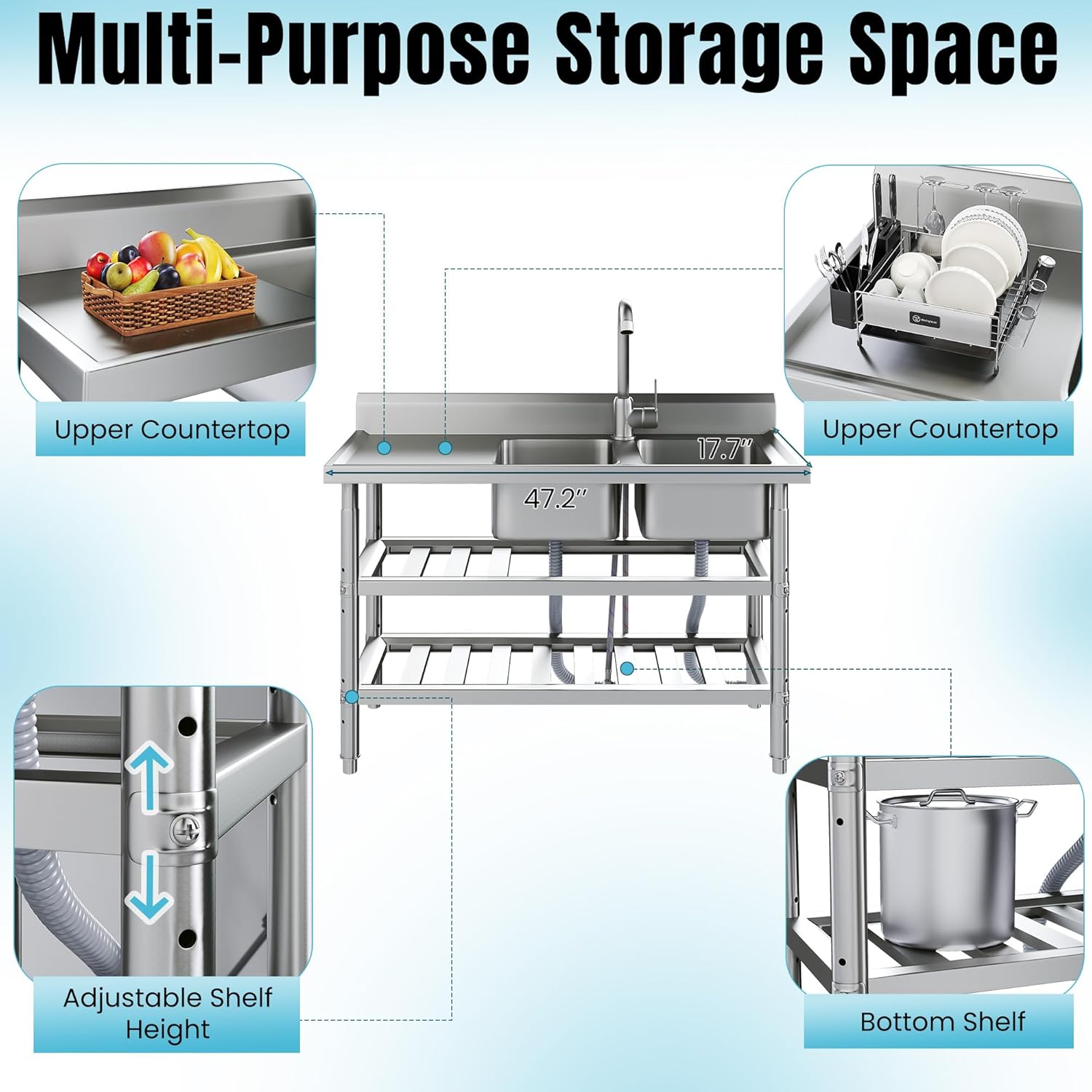 • Extra counter space and storage: The free-standing sink is equipped with a wide public panel and multi-layer open shelves underneath, providing orderly storage space for tools and cleaning supplies. The large and deep washbasin will greatly simplify your workflow