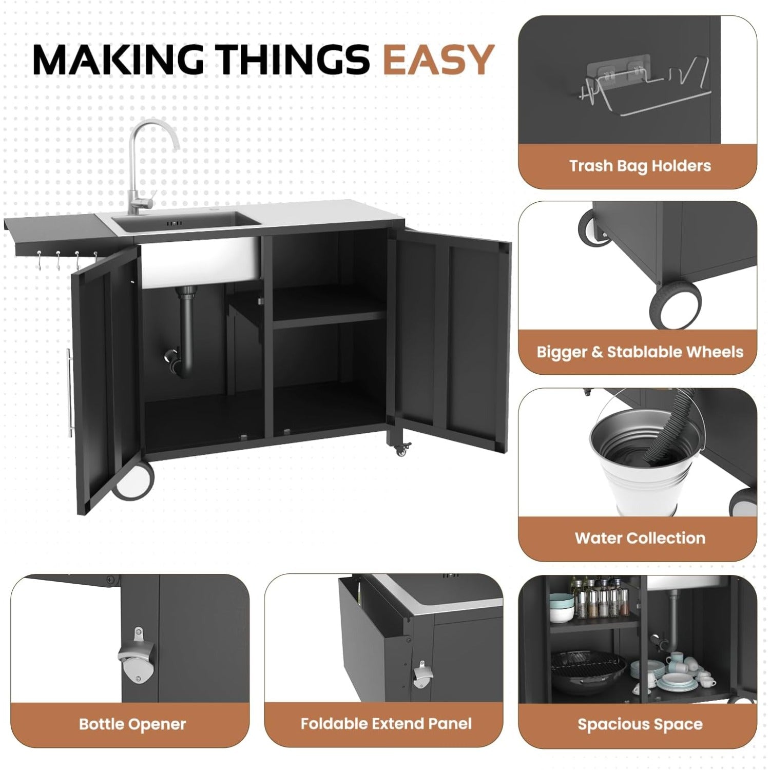 • 【Smart Multi-Functional Workspace】Expand your outdoor kitchen capabilities with a 38"-54" adjustable workstation featuring prep surfaces and dedicated zones for grilling tools The integrated 7.7'' deep basin sink with debris filter pairs with 60+ gallon enclosed storage, 4 utensil hooks, trash bag holder, integrated bottle opener and paper towel rack for complete BBQ organization.