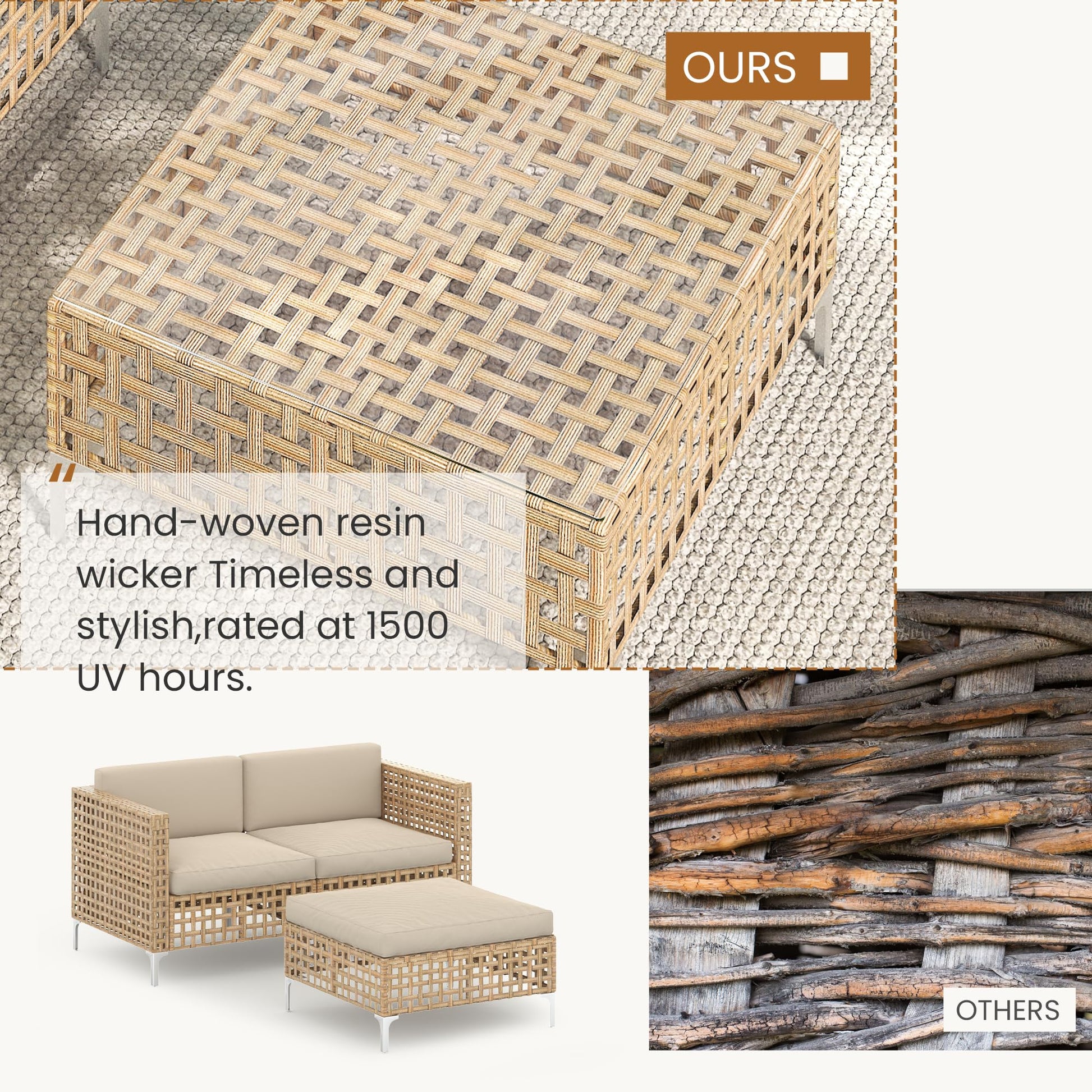 • New Boho Design -- This Boho-style patio sofa features beige cushions and beige wicker, creating a modern neutral color combination. The combination of simple lines and tapered metal legs gives a modern and elegant look. This sofa exudes a relaxed Bohemian and beach style, effortlessly blending with any home decor.