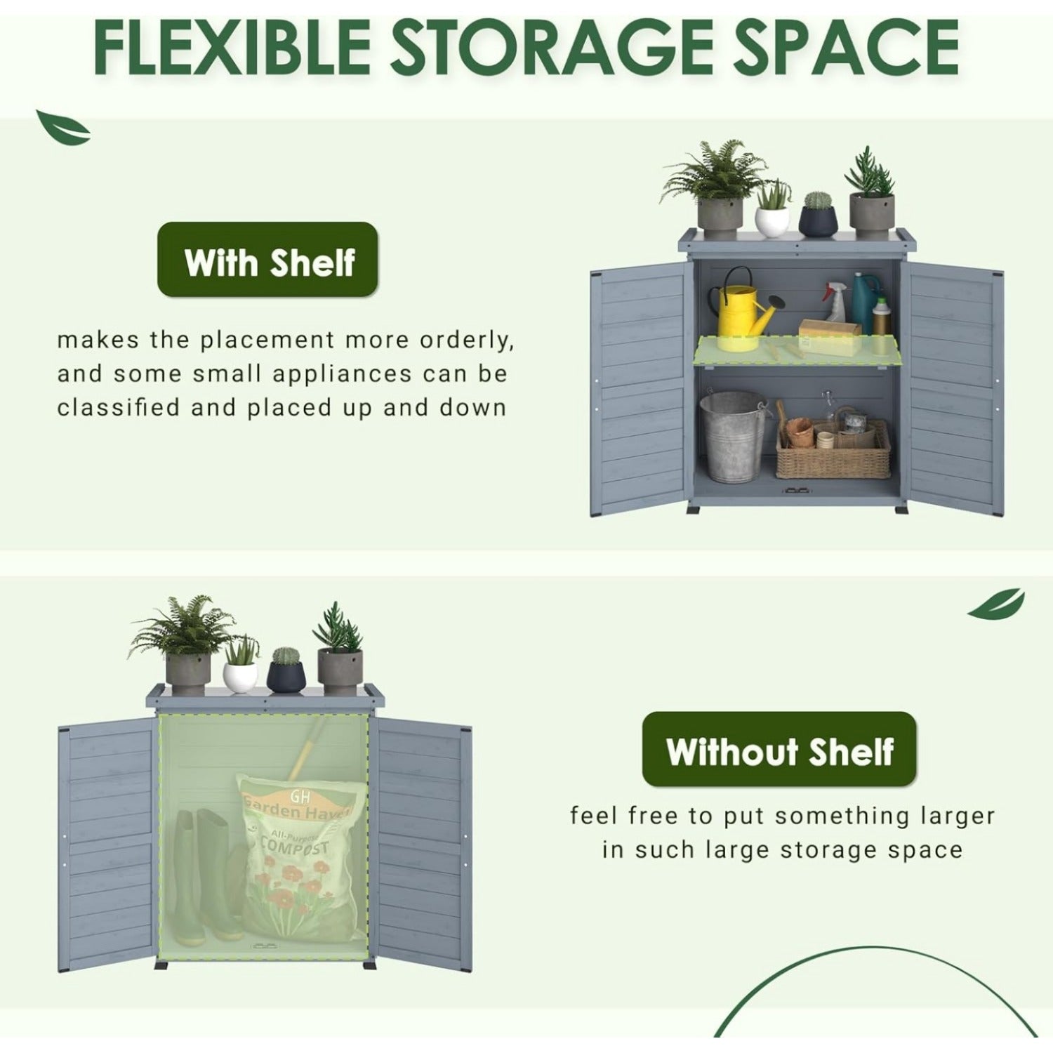 • 【Flexible Storage Space】You can move the shelves around or leave them alone as needed, making sure you have more flexibility to store potting tools, barbecue utensils, or other items.