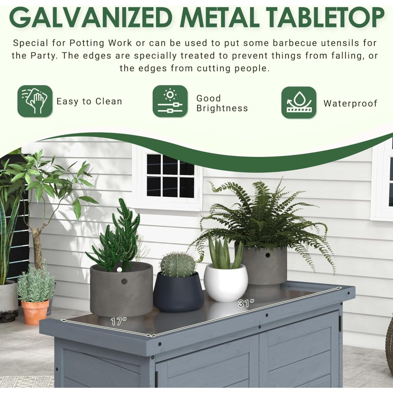 • 【Galvanized Metal Tabletop】Special for Potting Work or can be used to put some barbecue utensils for the Party. The edges are specially treated to prevent things from falling, or the edges from cutting people.