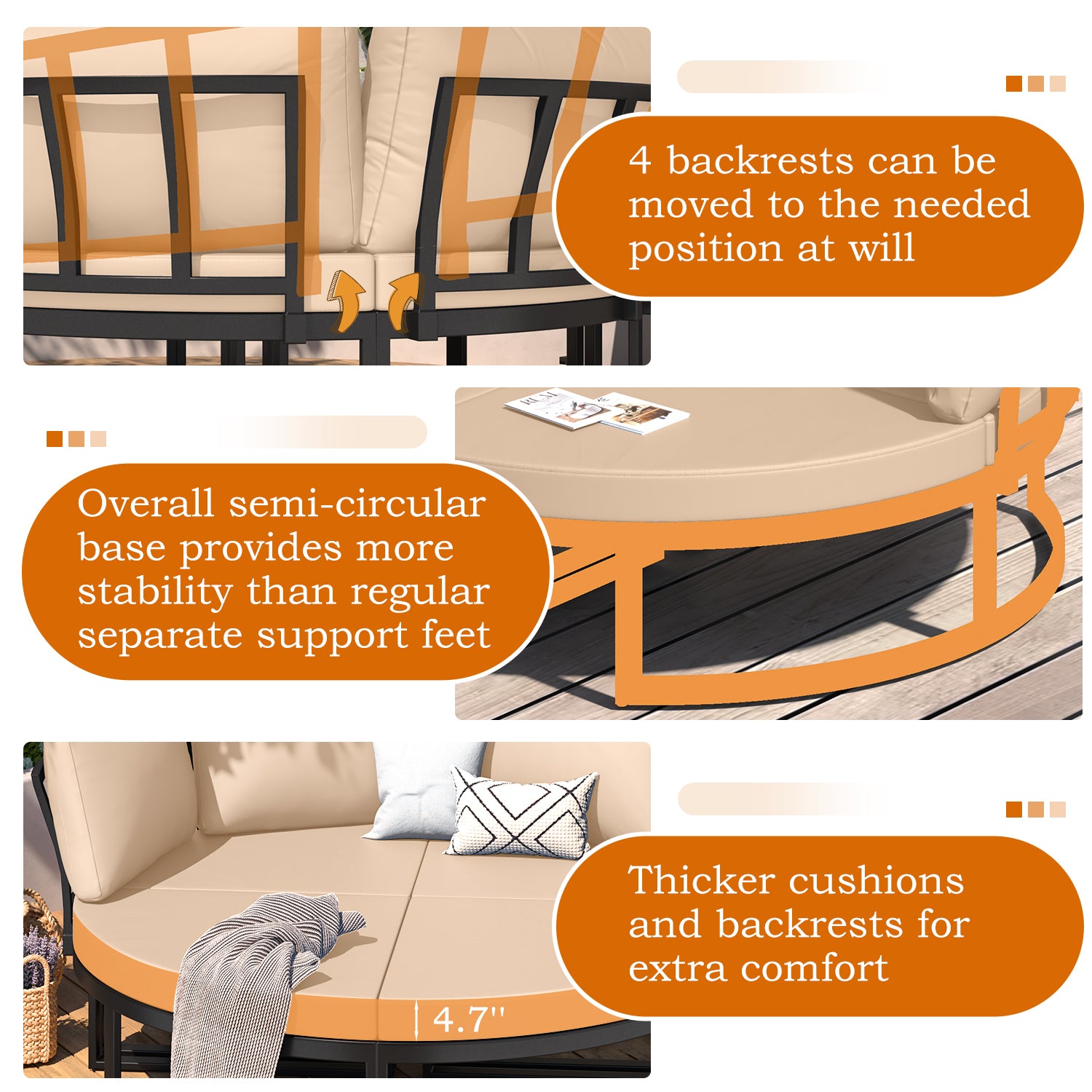 Unlike traditional designs, this daybed features a semi-circular base that increases ground contact for enhanced stability, ensuring a safe and sturdy seating experience.